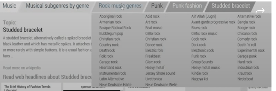 “Tell me about [Sub topic] in [Parent topic.] The parent in this example is Punk Fashion. A pulldown list that shows the Sub topics with the interest focus on “Studded bracelets.”