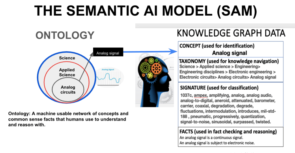 The graphic below shows a single knowledge node in SAM’s knowledge graph. There are millions. The example shown is the engineering concept “Analog signal.” This illustrates the complexity and diversity required to add human reasoning and understanding to AI. SAM’s vast tree of knowledge has billions of contextual pathways connecting millions of concept nodes connected to form common sense facts. The parent node in the Taxonomy “Analog circuits” has over a hundred concepts under it.